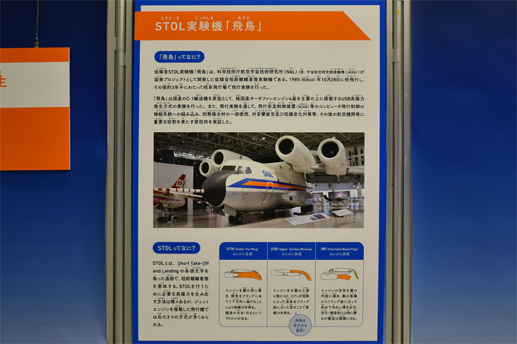 | 初飛行40周年記念企画展「飛鳥」が開催されていました。 短距離離着陸性能と飛行機の騒音を減らす技術を研究するために1機のみ製造された実験航空機です。 国産技術の研究を目的として、航空・電子技術や空力設計の先進的な試みが取り入れられました。 |