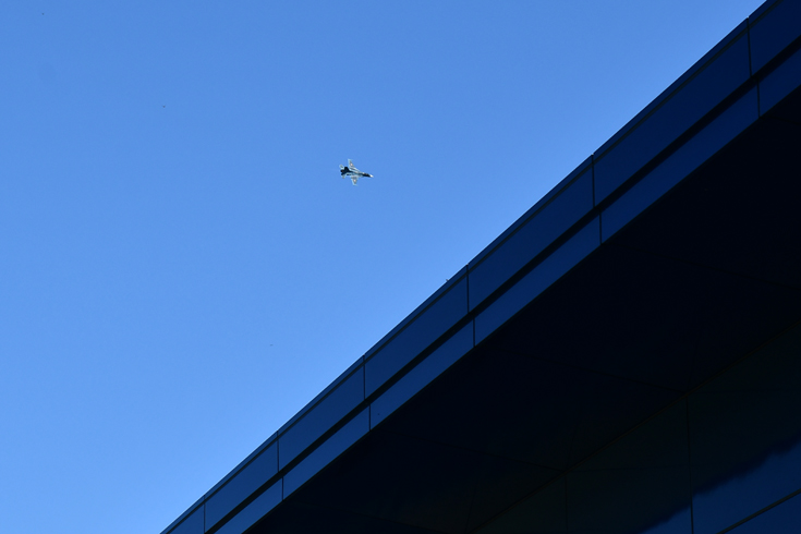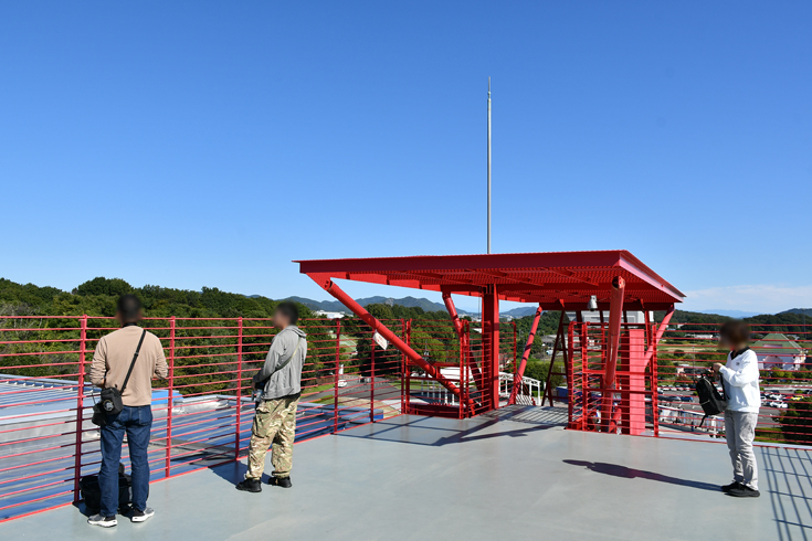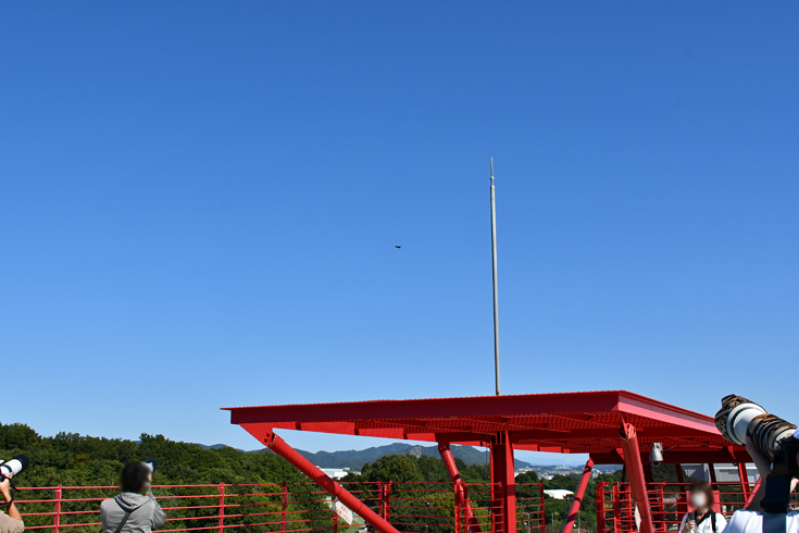 写真中央に見える赤色の構造物が展望デッキです。 午後0時45分頃、機動飛行が終了しました。 |