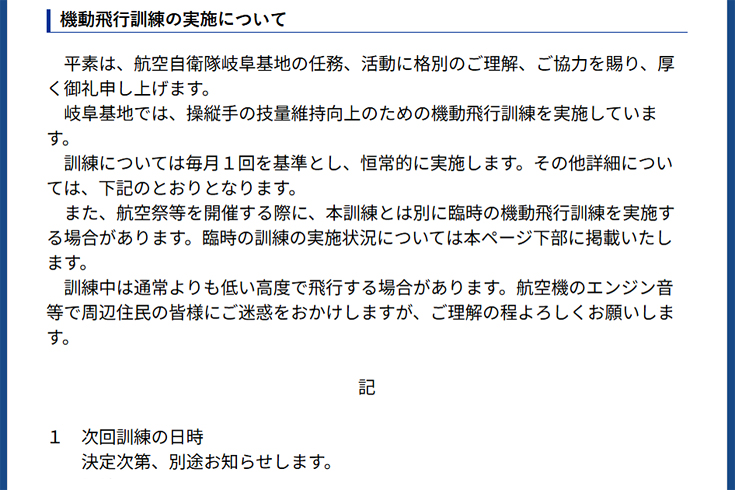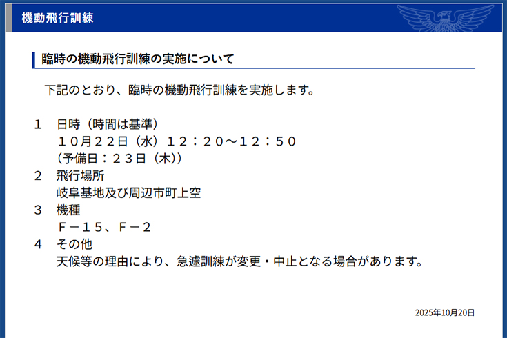 | 帰宅後に航空自衛隊岐阜基地のHPを見たところ、臨時の機動飛行訓練が公開されていました。 |