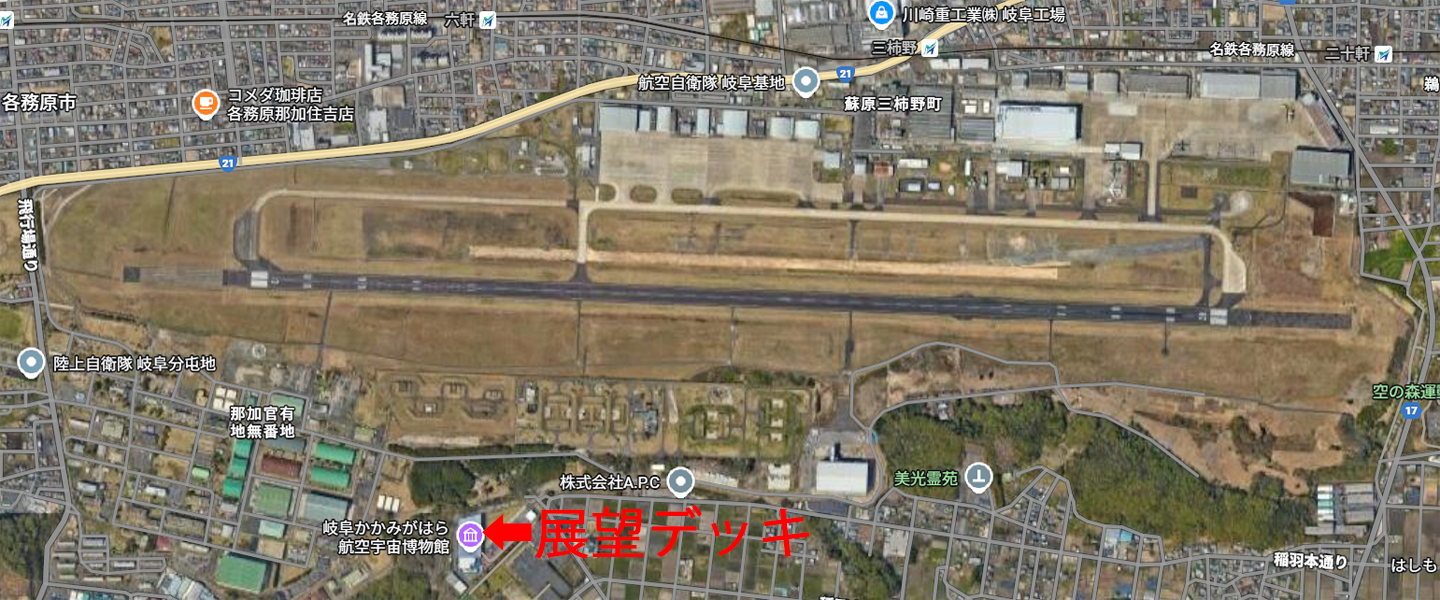 | 岐阜基地周辺の様子です。 土地勘が無いので、機動飛行訓練を見る最適な場所か分かりません。 展望デッキや駐車場には、機動飛行訓練の実施予定時間にカメラを持った人が集まっていたので、そらはく周辺が見易いのかもしれません。 この画像はGoole